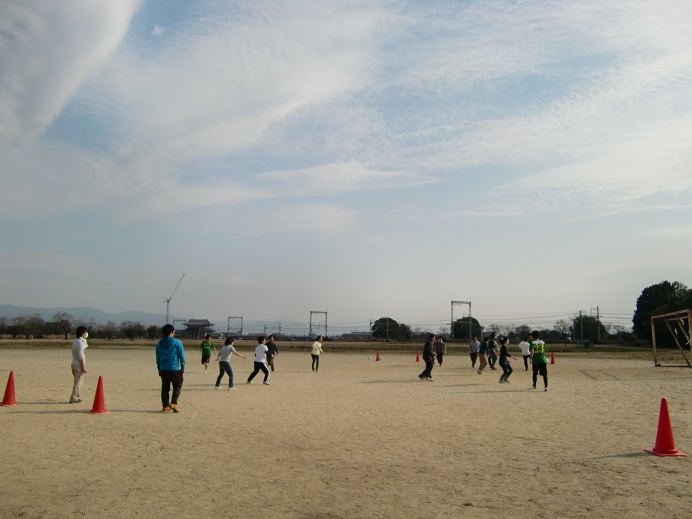 電車で移動し平城宮跡のサッカーグラウンドにて活動しました。梅林の近くだったので梅も見え、朱雀門や電車も見え、良いロケーションでした♪