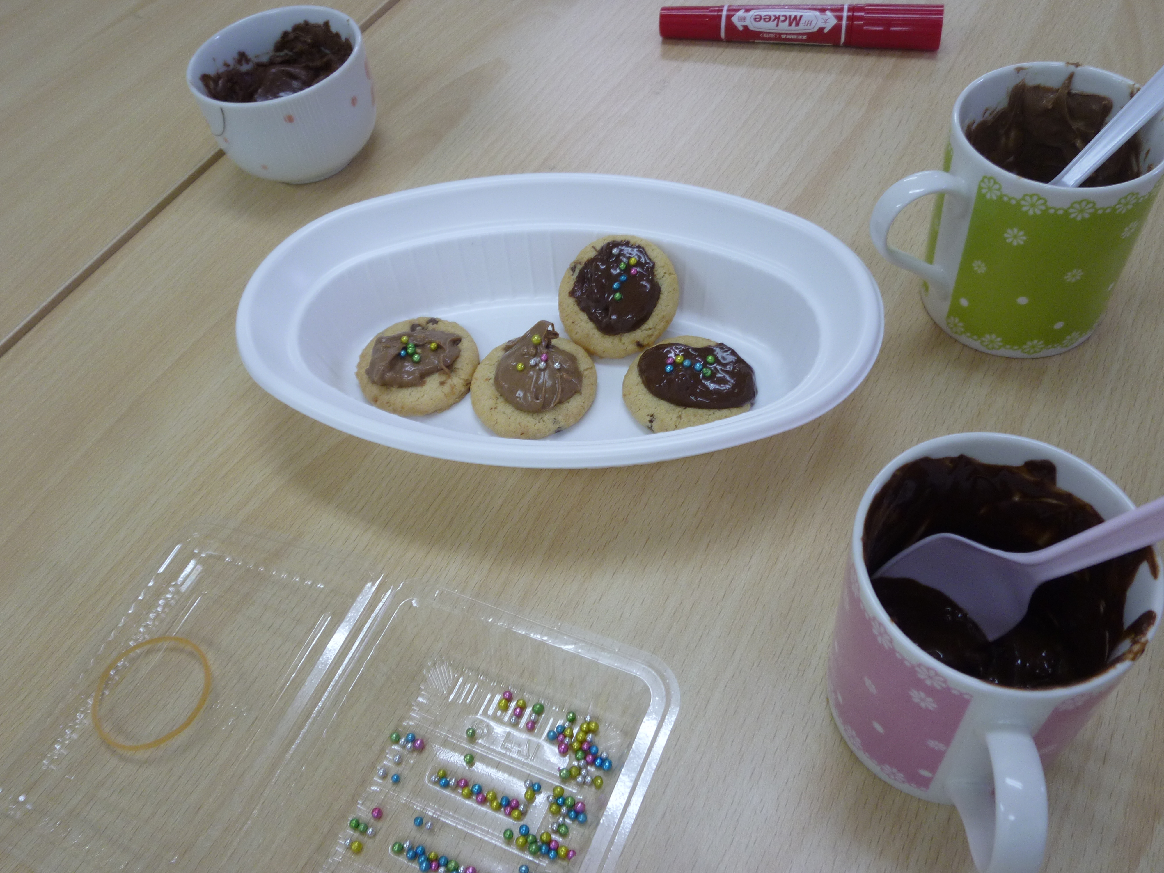 アラザン(砂糖でできたカラフルな丸いお菓子)を各々トッピングします。