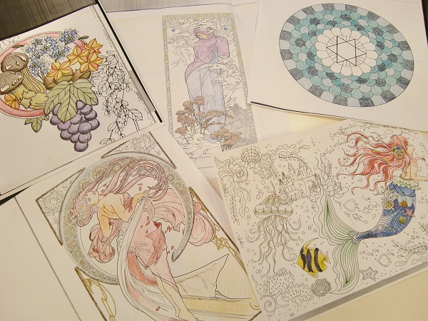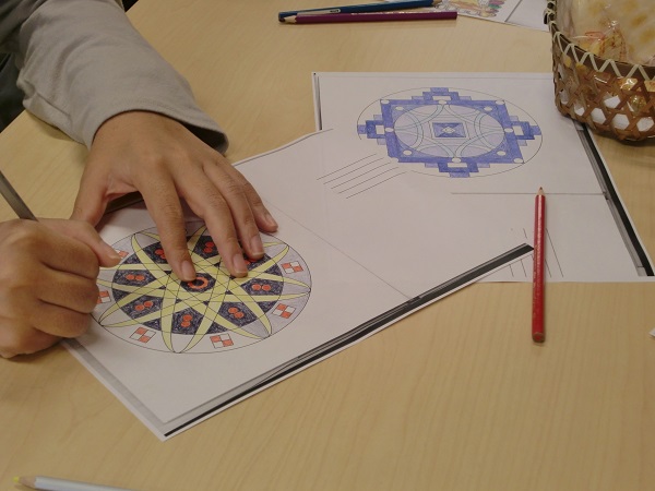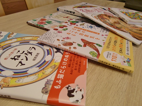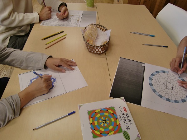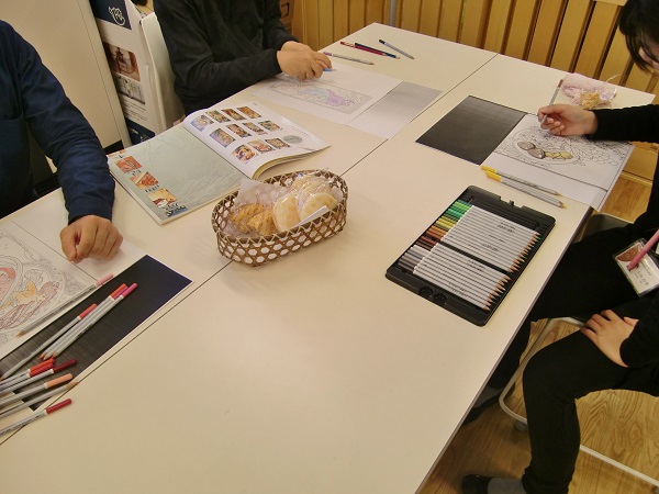 お菓子を食べて、白檀のお香をたいて、ピアノがかっこいいジャズを流して・・・なんとも贅沢でおしゃれな空間で、職員も一緒になってひたすら塗り塗りです。