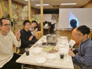 訓練納めの翌日の12/29(木)17:00から、忘年会を開催しました。メインは水炊き、ほかにもとんぺい焼きとデザート(マシュマロババロア)を食べました。忘年会なので、お酒も飲めます。が、そんな中、一番人気はコーラでした(^^)