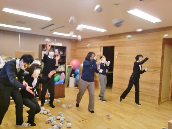 パーテーションを挟んで、豆(新聞紙を丸めたもの)をひたすら投げ合います!